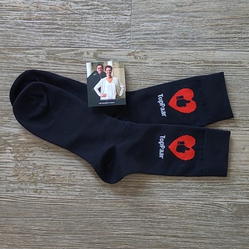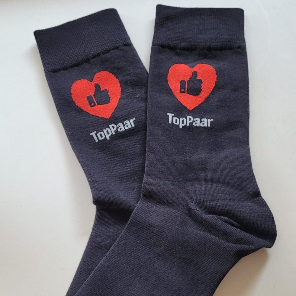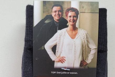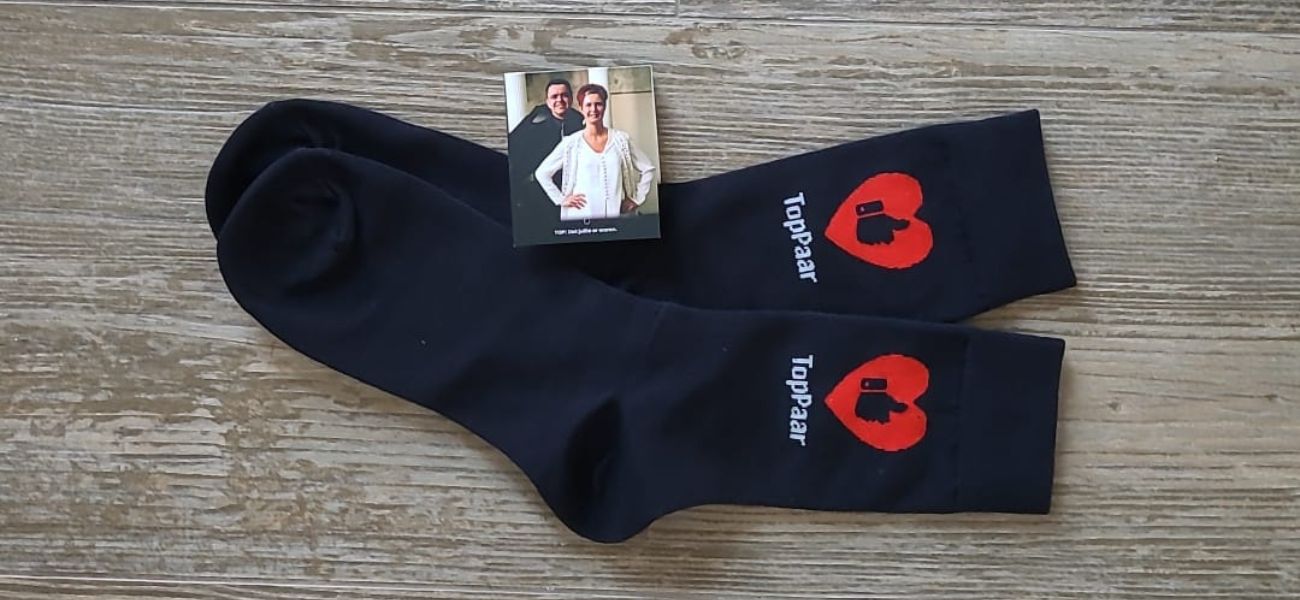 “Mijn man en ik zijn inmiddels 25 jaar getrouwd. Dan heb je veel foto’s en herinneringen samen! Mijn man reageert vrijwel altijd met een 👍🏻 op berichten en foto’s. Ik verzorg de kleding van voetbalteams. En sokken die niet goed zitten, zijn wat mij betreft een rode kaart 😉. Dat hebben we samengevoegd in het ontwerp voor de Sokkies. Een top👍🏻paar vol liefde!”