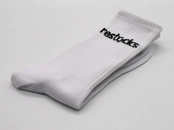 The question from Restocks was a simple one: can you make white sports socks with our logo? The answer was even simpler: yes! We created a clean, classic design of white sports socks with a pop-out black logo.
